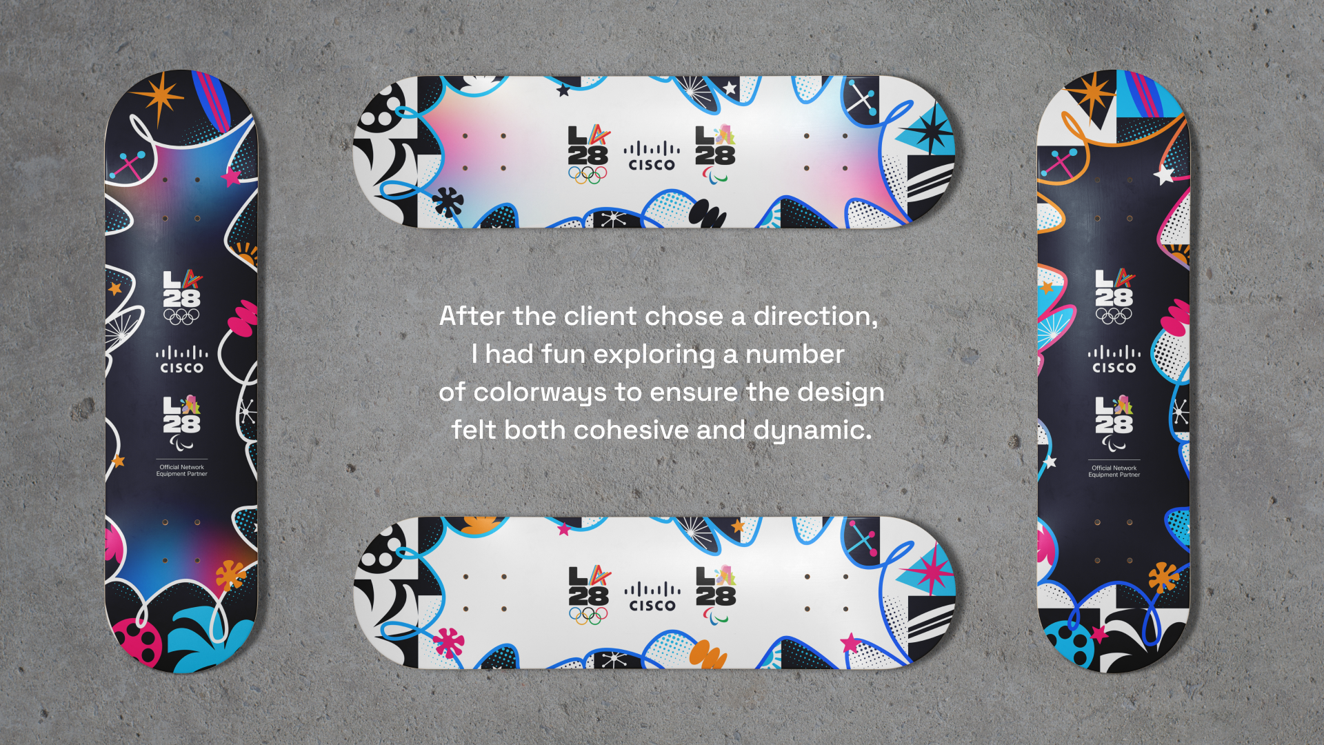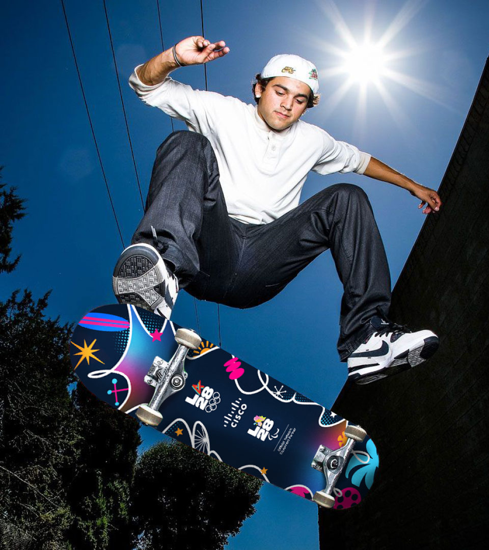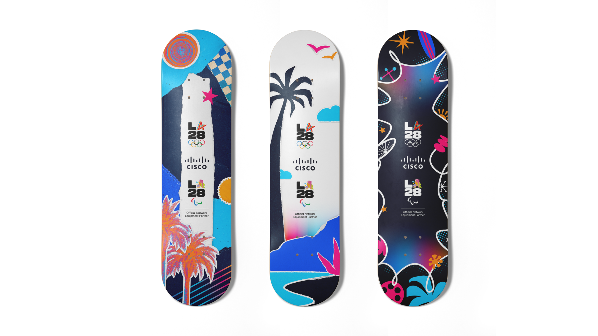Cisco is the Official Network Equipment Partner of the LA28 Olympics. These skateboard decks were created to celebrate that partnership. Each design blends Cisco’s brand with LA’s vibrant skate culture, incorporating inspiration from local graffiti, paper collage textures, palm-lined streets, & Olympic energy.