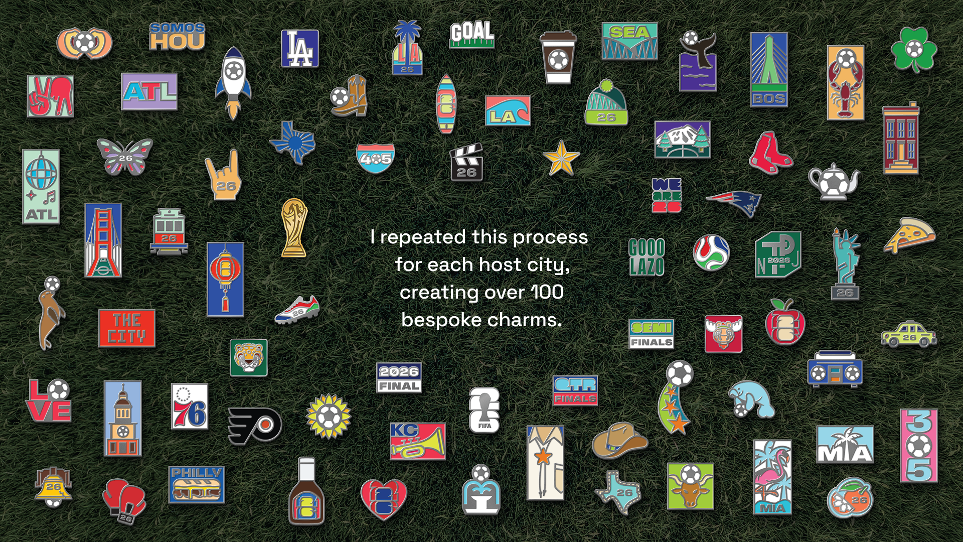 Bank of America is activating at FIFA Fan Fests across the country, providing World Cup attendees with the chance to customize their own charm bracelets. I was tasked with designing over 200 charms that reflect FIFA’s branding and emphasize the uniqueness of each host city.
